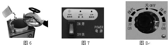 滅菌器開蓋狀態(tài)下,將醫(yī)用蒸餾水直接注入滅菌器內約8升(圖6),同時觀察控制面板(圖7)上的水位燈,當加水**低水位燈滅,應繼續(xù)加水**高水位燈亮時停止加水(每次使用前均需補足上述水位)。當加水過多溢**內膽中時,應開啟下排水閥放去內膽中的多余水(圖8)。