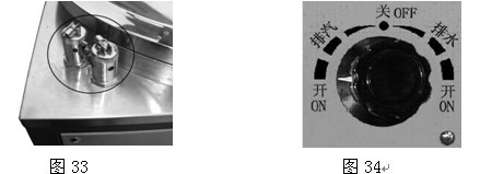 有的物品滅菌后需要迅速干燥,須打開(kāi)安全閥(圖33)或?qū)⑴牌潘傞y向左旋轉(zhuǎn)**“開(kāi)”位置(圖34),讓滅菌器內(nèi)的蒸汽迅速排出,使物品上殘留水蒸汽快速揮發(fā)。滅菌液體時(shí)嚴(yán)禁使用干燥方法。