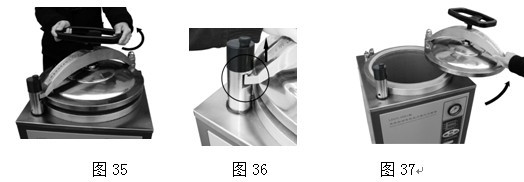 壓力表指針歸零后按(圖35)逆時(shí)針轉(zhuǎn)動(dòng)手輪數(shù)圈,直**轉(zhuǎn)動(dòng)到頂,使滅菌器蓋充分提起,拉起左立柱上的保險(xiǎn)銷(圖36),向右推開(kāi)橫梁(圖37)移開(kāi)鍋蓋,一個(gè)滅菌周期結(jié)束。