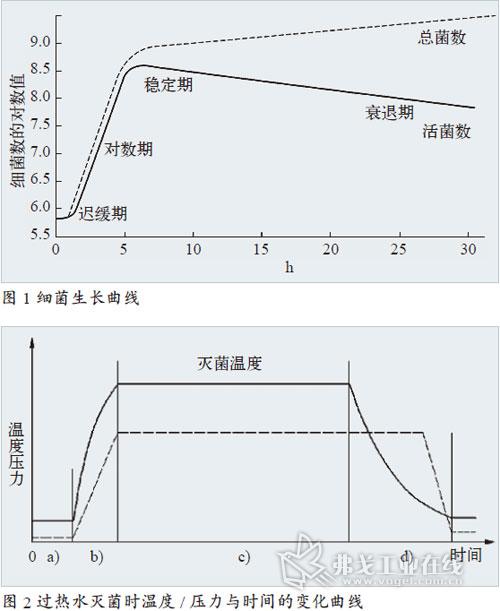 制藥用水儲(chǔ)存與分配系統(tǒng)會(huì)不斷滋生微生物,掌握純化水和注射用水系統(tǒng)的細(xì)菌生長(zhǎng)規(guī)律將有助于企業(yè)合理確認(rèn)制藥用水系統(tǒng)的消毒或滅菌周期。制藥用水系統(tǒng)中微生物負(fù)荷發(fā)展的趨勢(shì)可由“細(xì)菌生長(zhǎng)曲線”(圖1)間接反映,它是將少量的單細(xì)胞微生物純種接種到一定容積的液體培養(yǎng)基后,在適宜的條件下培養(yǎng),定時(shí)取樣測(cè)定細(xì)胞數(shù)量繪制而成的一條曲線,該曲線以細(xì)胞增長(zhǎng)數(shù)目的對(duì)數(shù)為縱坐標(biāo),以培養(yǎng)時(shí)間為橫坐標(biāo)。