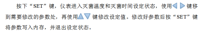 蓋上滅菌器蓋,滅菌器蓋閉合到位后將開(kāi)啟手柄撥**關(guān)閉位置,門狀態(tài)燈亮。當(dāng)滅菌器門閉合到位3秒后,聯(lián)鎖鎖止,聯(lián)鎖指示燈亮。 2.6 設(shè)定溫度和時(shí)間
